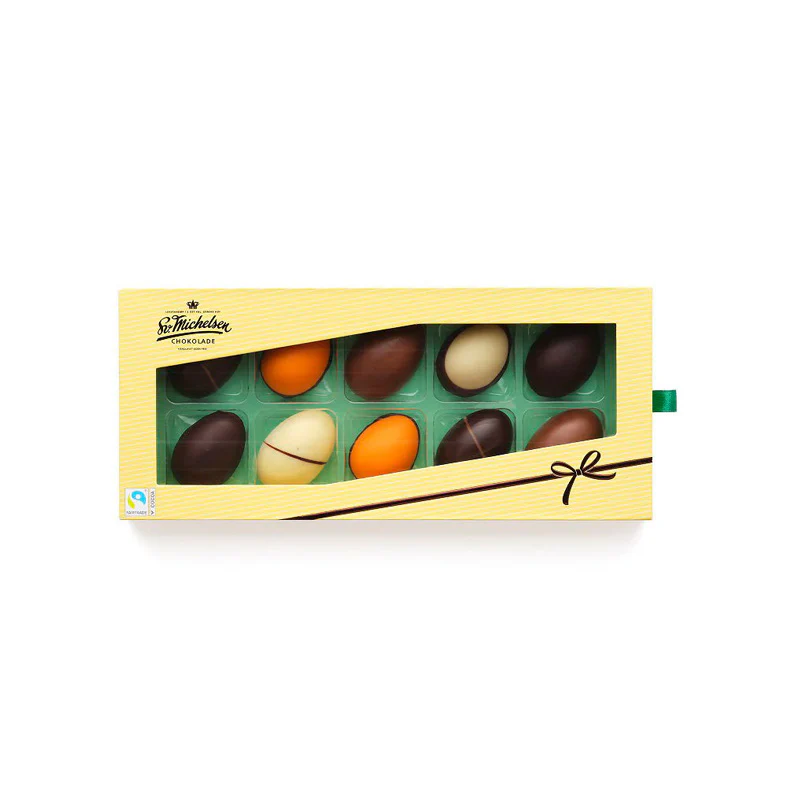 Sv. Michelsens traditionelle skuffeæske med chokoladepåskeæg. Som altid er Sv. Michelsens chokolader fairtrade og håndlavede. I æsken finder du 10 fyldte påskeæg.